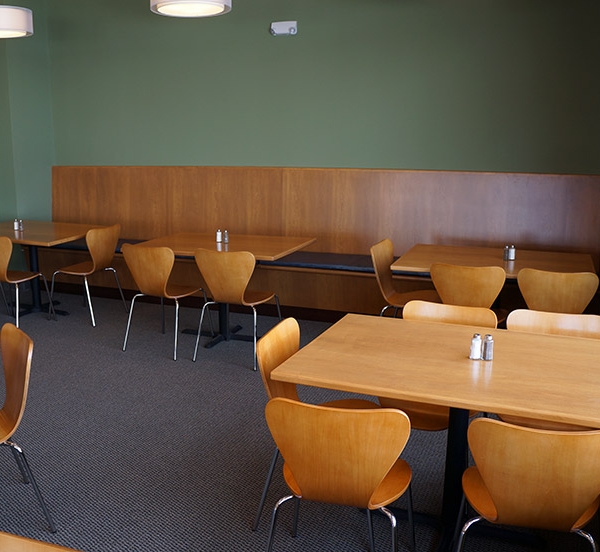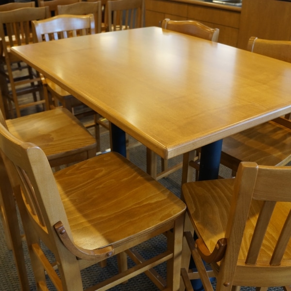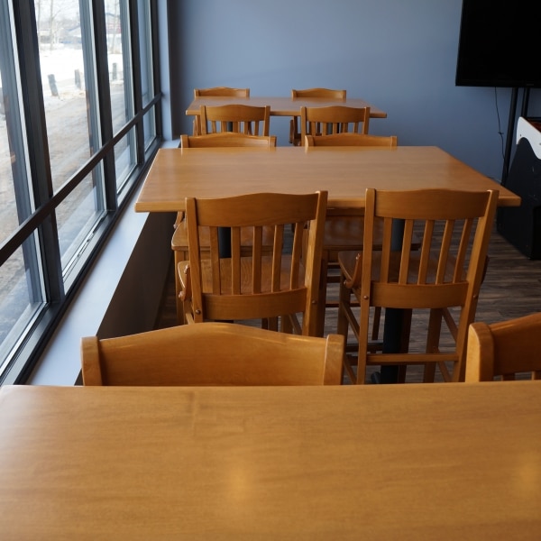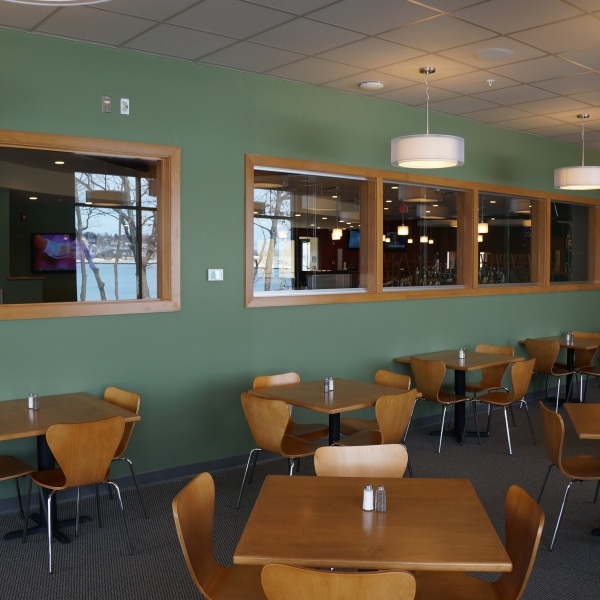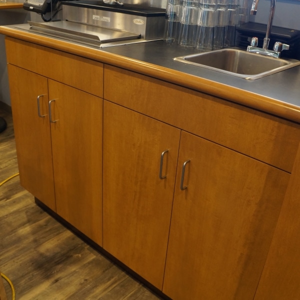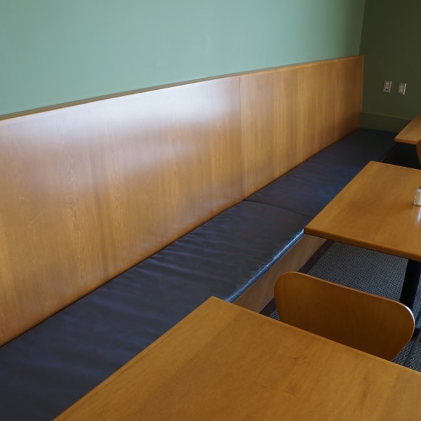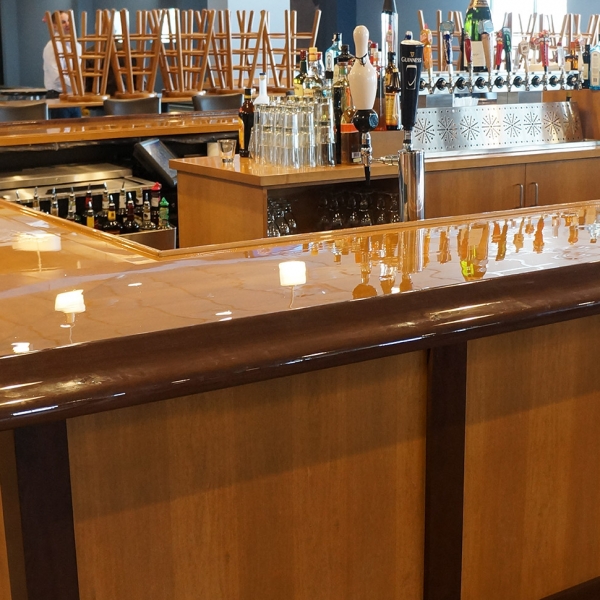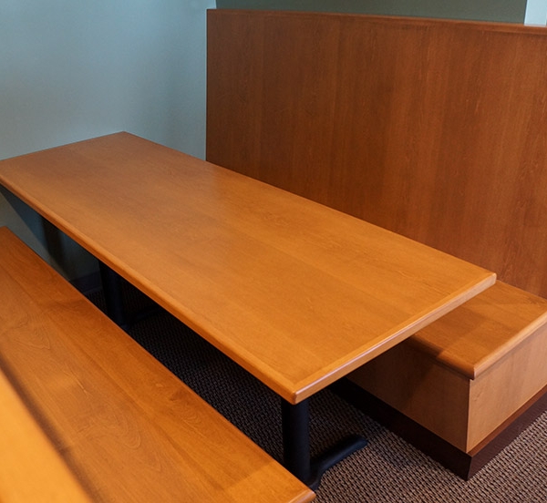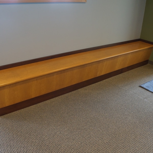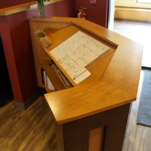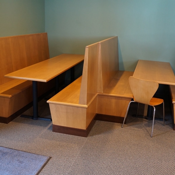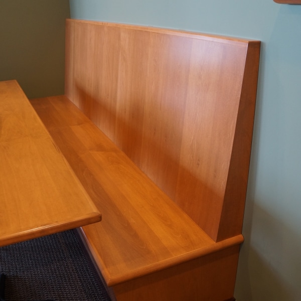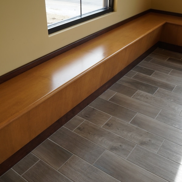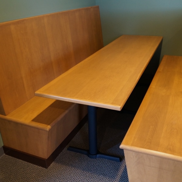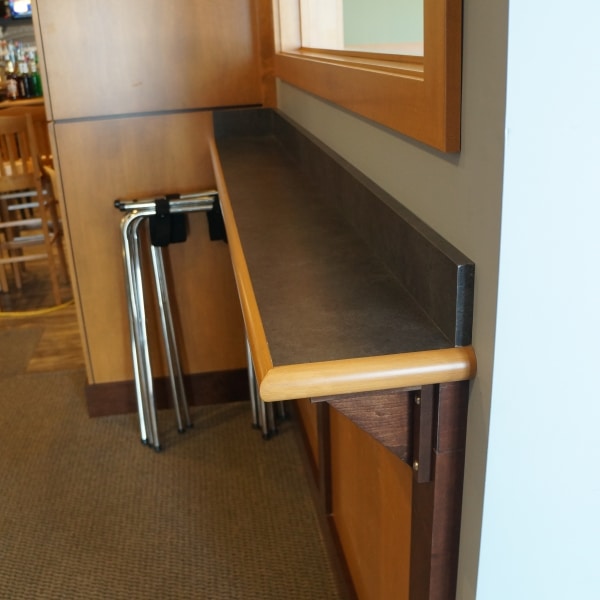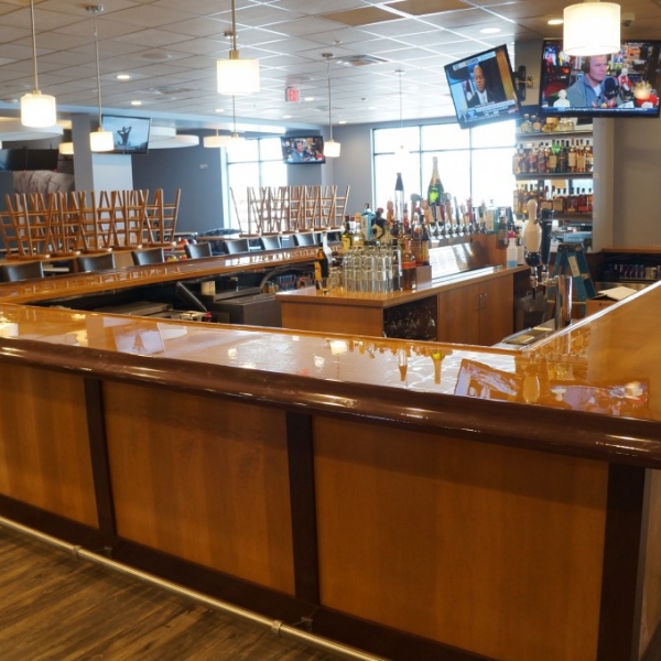 The restaurant end of the building displays some beautiful pieces of millwork. Once you enter the building you are met in the waiting room by custom benches and a custom Easy Day Restaurant hostess station that welcomes you as soon as you open the door. The massive 73′ custom maple bar is the centerpiece of the entire restaurant and focal point as you walk in. Inside the bar WMI also created a 9′ island to display its liquor and a tap tower on top. Windham Millwork manufactured 39 custom restaurant tables of all sizes throughout. The custom maple benches, banquettes and booths were also built by WMI. Wall caps, sliding glass doors, casings, jambs, waitress stations and drink rails can also be noticed in the dining area. Office countertops and cabinets were all a part of the work that WMI completed at Easy Day Restaurant.