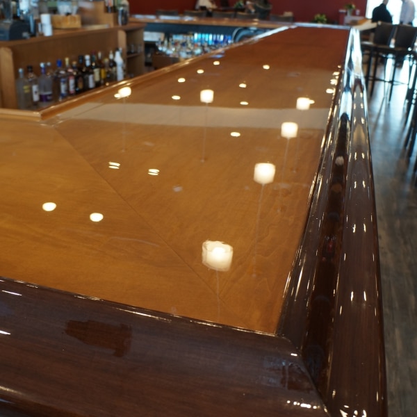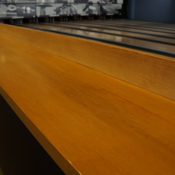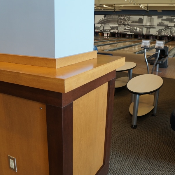 Inside Easy Day, all of the maple millwork showcased was handcrafted and installed by Windham Millwork. The bowling alley area displays a curved check in desk custom built for the space with maple shoe racks built behind it. A large drink rail over looking the bowling lanes allows a waiting area for customers to hang out before they bowl. There are numerous columns that are wrapped with maple panels that match the color scheme of the entire restaurant throughout.