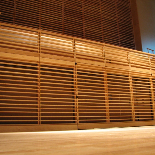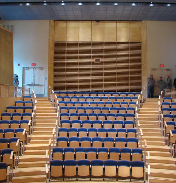 Bowdoin College Recital Hall was a challenging but rewarding job for the Windham Millwork, Inc workforce. Our preconstruction design techniques were put to the test with this geometric challenge. Curved paneling, trim, folding slat doors, curved cloud paneling, stairs and handrail were some of the woodwork WMI was involved with.