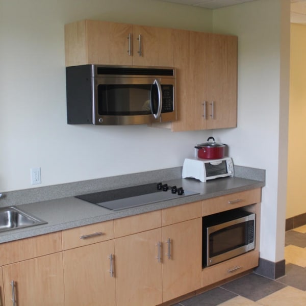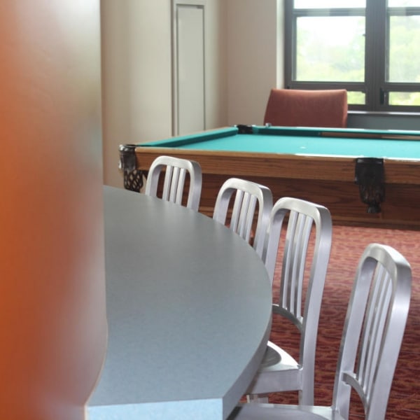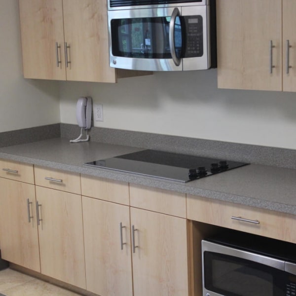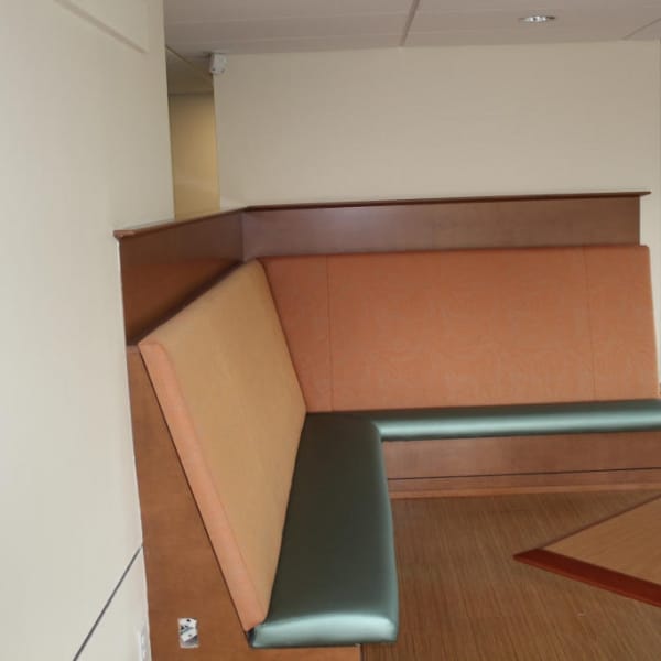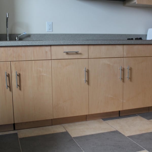 Beautiful banquet seating and custom kitchens in the common room areas of each floor were custom made and installed by Windham Millwork. Each room had its own bathroom where vanities and solid surface shower surrounds were manufactured and installed for Endicott College.