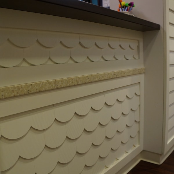 In the reception area WMI created a reception desk that featured solid surface, shaker style shingles and painted wood. It made for a beautiful entrance piece for customers to see when entering the office. WMI also removed and relocated previous millwork and casework from Southern Maine Pediatric Dentistry old location.