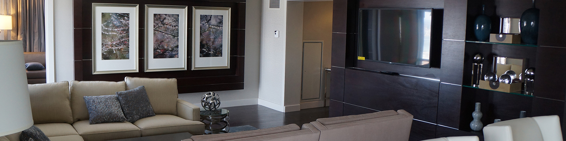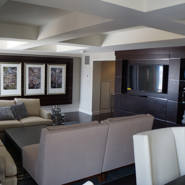 In all 288 guest rooms and the Presidential Suite, WMI high quality millwork is showcased. The guest-rooms were furnished and installed with closet doors, wet bars, countertops, window sills, vanity tops, and cabinets. In the Presidential Suite base, crown, door trim and valences are evident throughout. Additionally, a custom entertainment center and paneling helps magnify the living room of the suite.