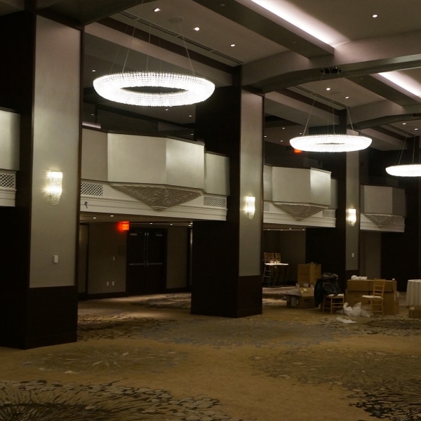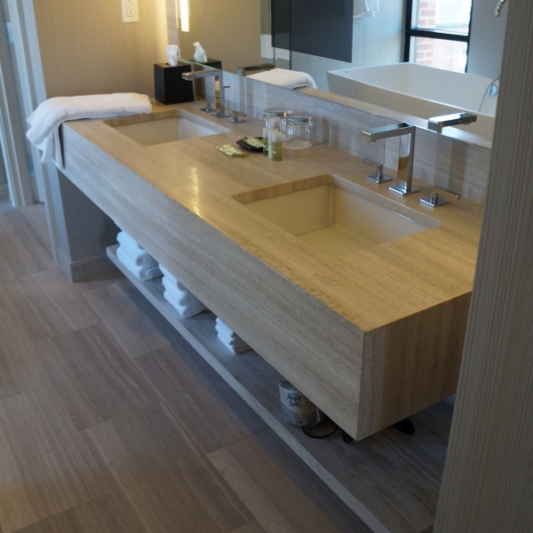 WMI was responsible for all the millwork and woodwork throughout the entire hotel. Mahogany and rift sawn white oak fill the entire project and give the hotel a sophisticated and elegant look. WMI manufactured and installed all the paneling within the lobby, corridors and ball rooms. The reception desks and decorative paneling that sits behind with the Westin logo were all furnished by WMI. The custom slatted wall is very visible upon entering the hotel both in the front and towards the back of the lobby. In all the lobby bathrooms Windham furnished and installed custom mahogany stall doors and vanity countertops. All trim and base mould were also completed by WMI. Ceiling panels, elevator panels and other decorative custom millwork can be seen throughout the entire entrance of the hotel.