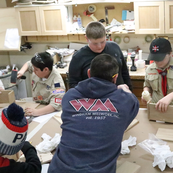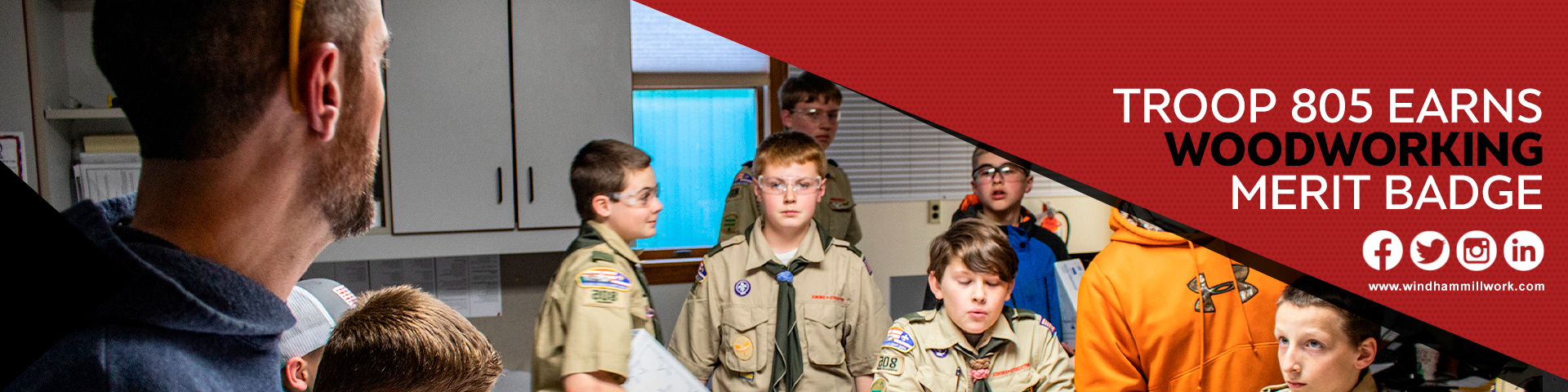 Boy Scout Troop 805 of Windham Maine earned their Woodworking Merit Badge with a visit to Windham Millwork Inc. We taught troop 805 many aspects of the woodworking process including growing, harvesting, milling, curing/seasoning, grading, sizing and cutting.