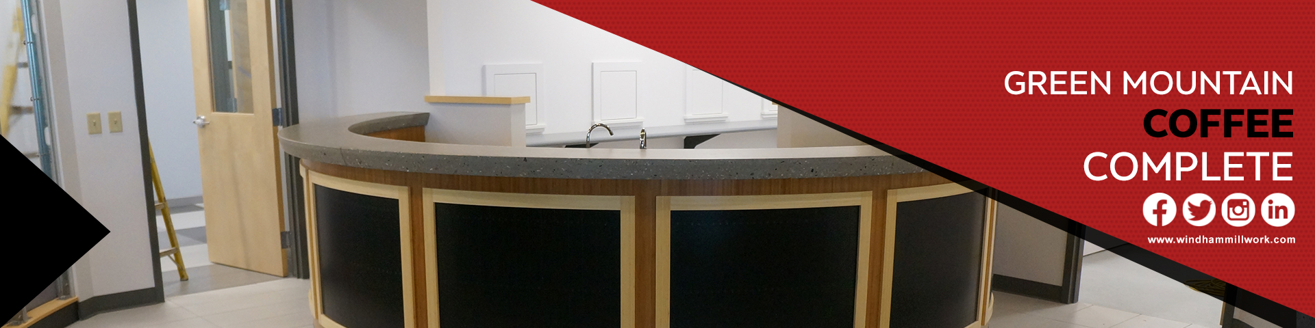 Green Mountain Coffee’s R&D Facility shows a lot of talent that WMI can provide. This building featured cabinets, casework, custom paneling, custom reception desks and a variety of countertop materials. All furnished and installed by Windham Millwork, Inc. In conclusion, WMI is proud to be able to provide Green Mountain Coffee with the high quality woodwork for their new facility.